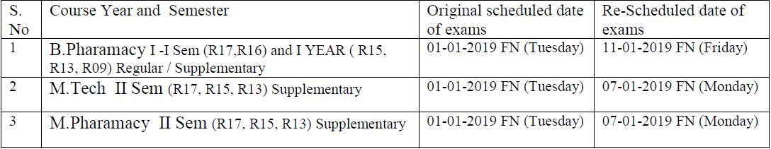 It is here by informed that the B.Pharmacy / M.Tech /M. Pharamacy courses, Examinations to be held on 01-01-2019 are postponed and rescheduled as mentioned below, due to holiday declared by the Government of Telangana.