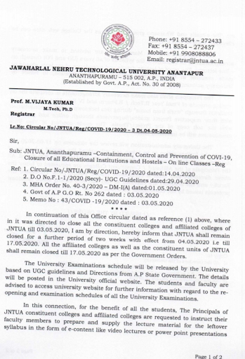 JNTUA – COVID-19 Lock Down Extension upto 17-05-2020